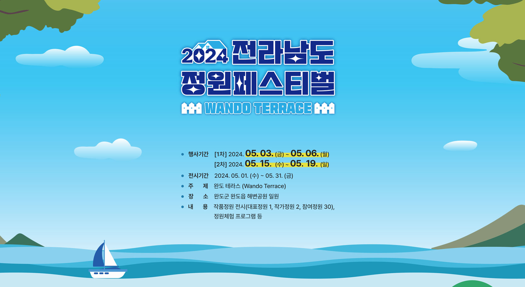 이번 페스티벌은 2024년 5월 1일부터 5월 31일까지 한 달간, 완도군 해변공원 일원에서 펼쳐지는데요, 아름다운 남도의 바다를 배경으로 한 해변 정원에서 진행되어 더욱 특별합니다.