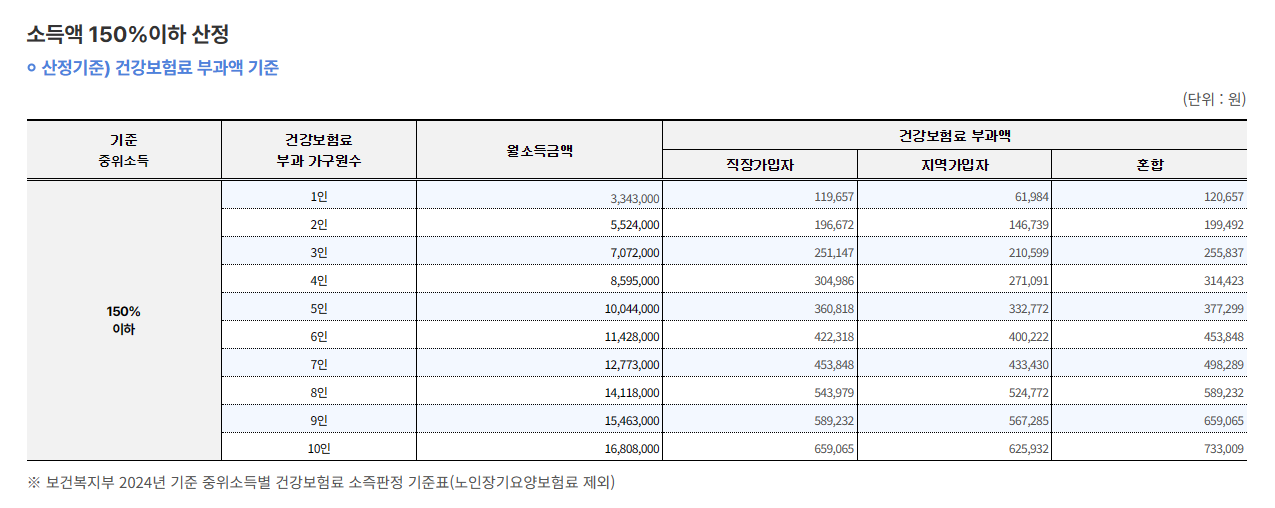 . 신청인이 속한 가구의 건강보험료 부과액(최근 3개월(‘24년 1월~3월) 평균액)이 ‘24년 기준 중위소득 150% 이하의 건강보험료 부과액을 충족해야 함.