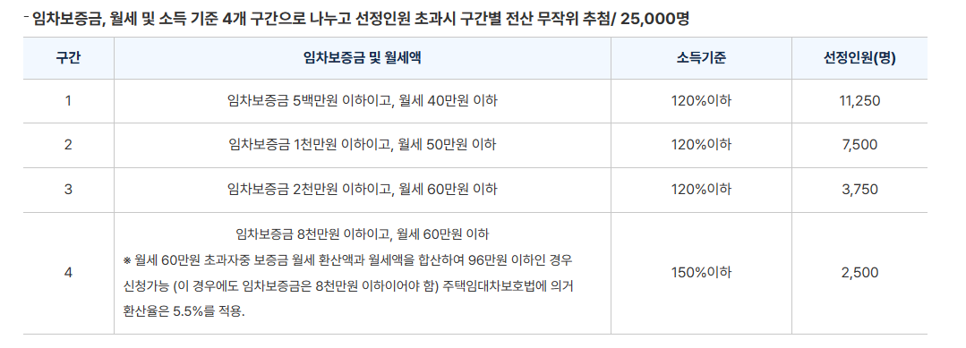 임차보증금, 월세 및 소득 기준 4개 구간으로 나누고 선정인원 초과 시 구간별 전산 무작위 추첨 / 25,000명