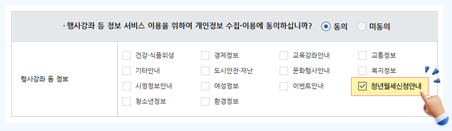 ③ 회원정보 변경 페이지 - 행사강좌 등 정보 서비스 이용을 위한 개인정보 수집·이용 항목 내 “청년월세신청안내” 선택 후 저장