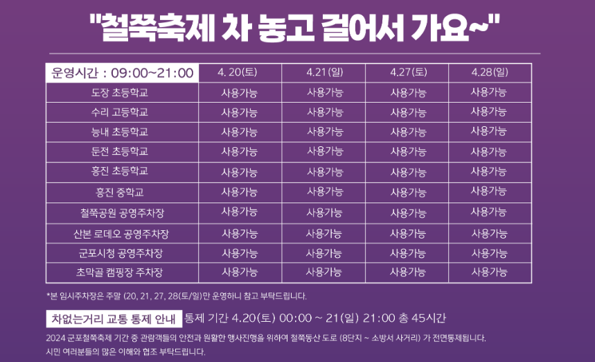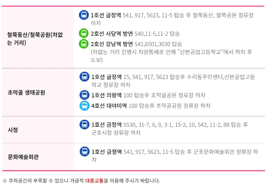 - 지하철 이용: 군포철쭉축제는 지하철을 통해 접근이 가능하니, 대중교통을 이용하시는 분들도 편리하게 방문할 수 있습니다.