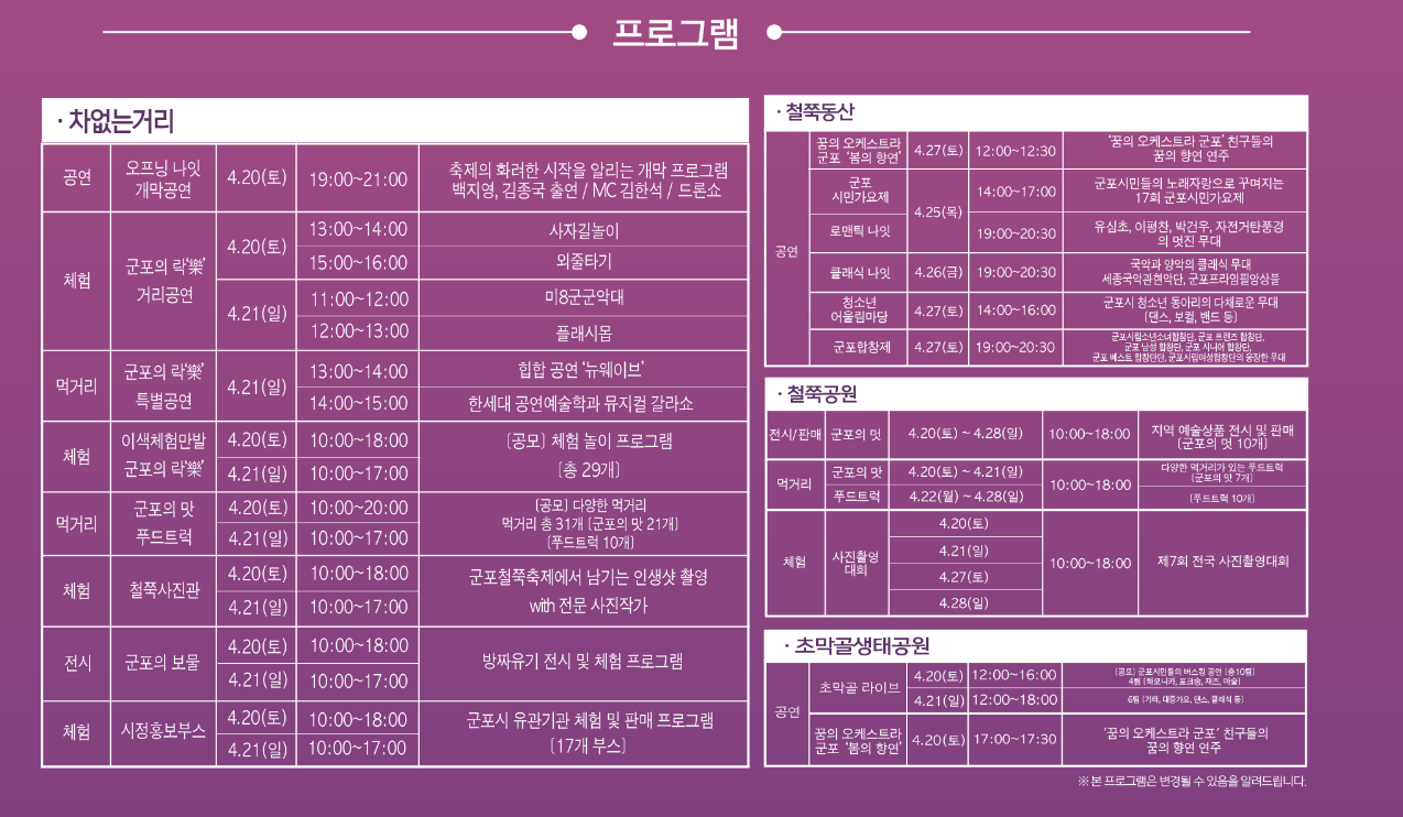 ▶ 그외 거리공연, 사진관, 군포의 보물, 시민가요제, 청소년 어울림마당 등 다채로운 행사가 많이 준비되어 있으니 꼭 가셔서 경험에 보시기 바랍니다.