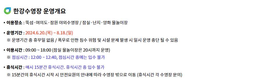 2024 한강 수영장, 물놀이장 이용 시간